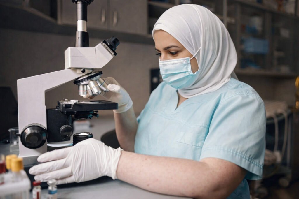 Arab doctor looking though microscope